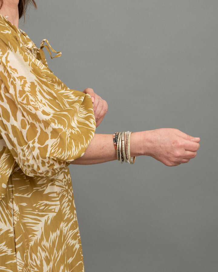 Blusa con motivi jungle a contrasto chiaro, manica 3/4 a palloncino , scollo a V con laccio