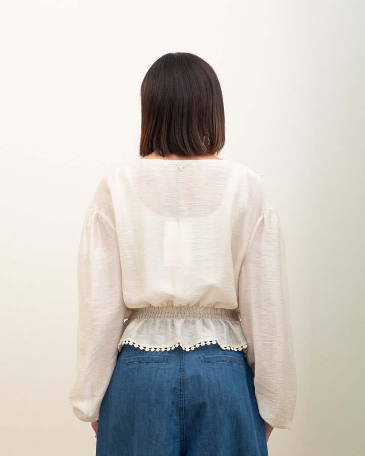 Blusa in tessuto leggero effetto naturale, con maniche ampie e arricciatura in vita che valorizza la figura con un tocco morbido.