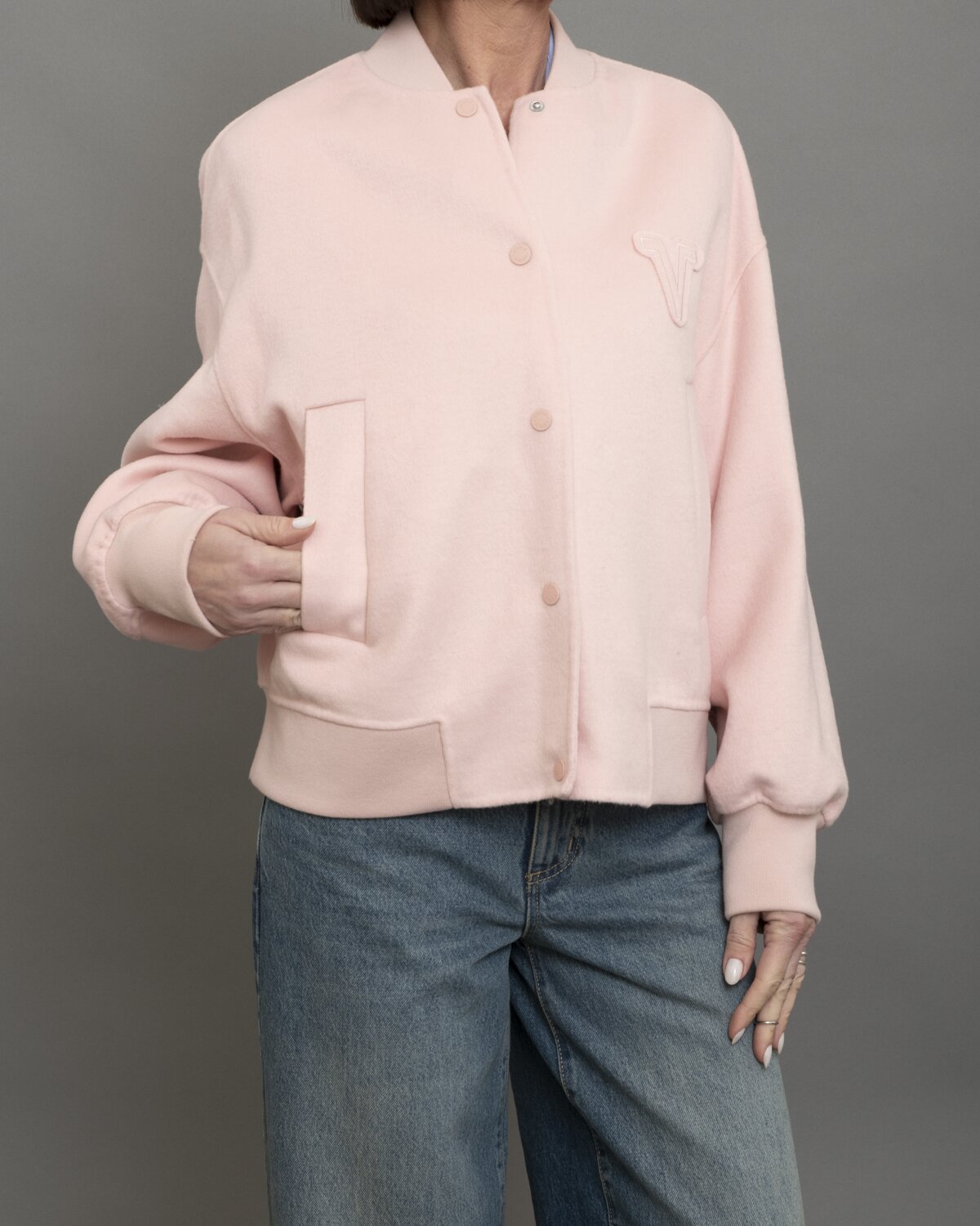 Bomber cappotto pensato per una primavera ricca di stile. Il tessuto combina la morbidezza e il calore della lana con la resistenza e la praticità del poliestere, creando una struttura compatta ma confortevole. Il taglio è essenziale, con dettagli curati che richiamano lestetica del bomber ma con la presenza sartoriale di un cappotto. Un capo dal carattere deciso, impreziosito da una patch con lettera V applicata sul petto. Il dettaglio grafico dona personalità e un tocco college. La lettera V diventa segno distintivo, tra stile urbano e richiami sportivi, perfetta per chi ama capi iconici ma versatili.