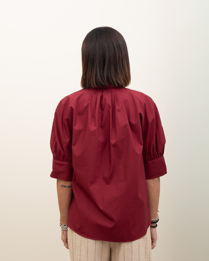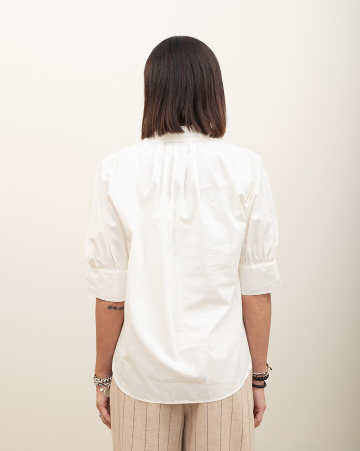 Camicia a maniche corte a palloncino, sfondo piega posteriore.