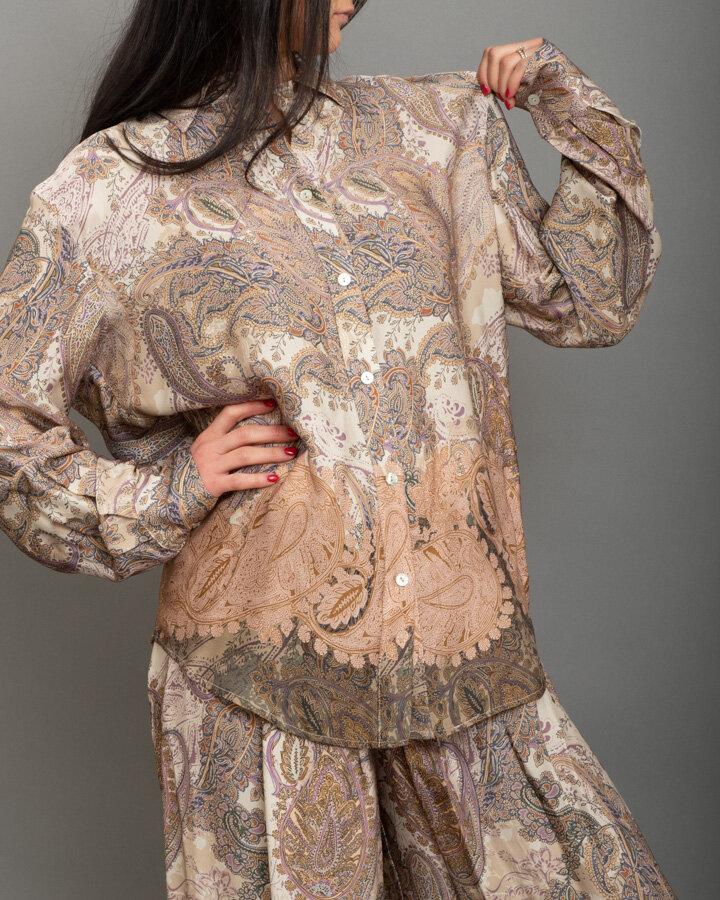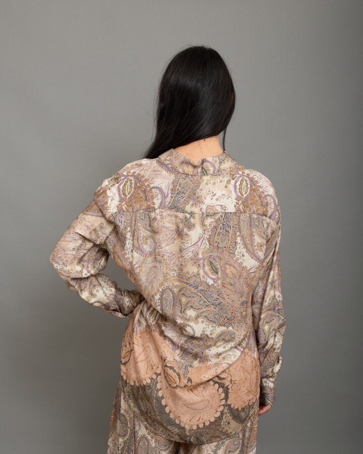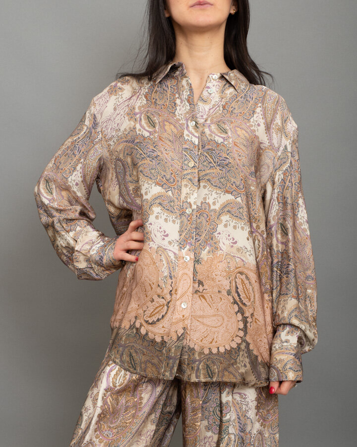 Camicia in tessuto stampato paisley , colletto classico, bottonatura frontale e maniche leggermente arricciate al polso.