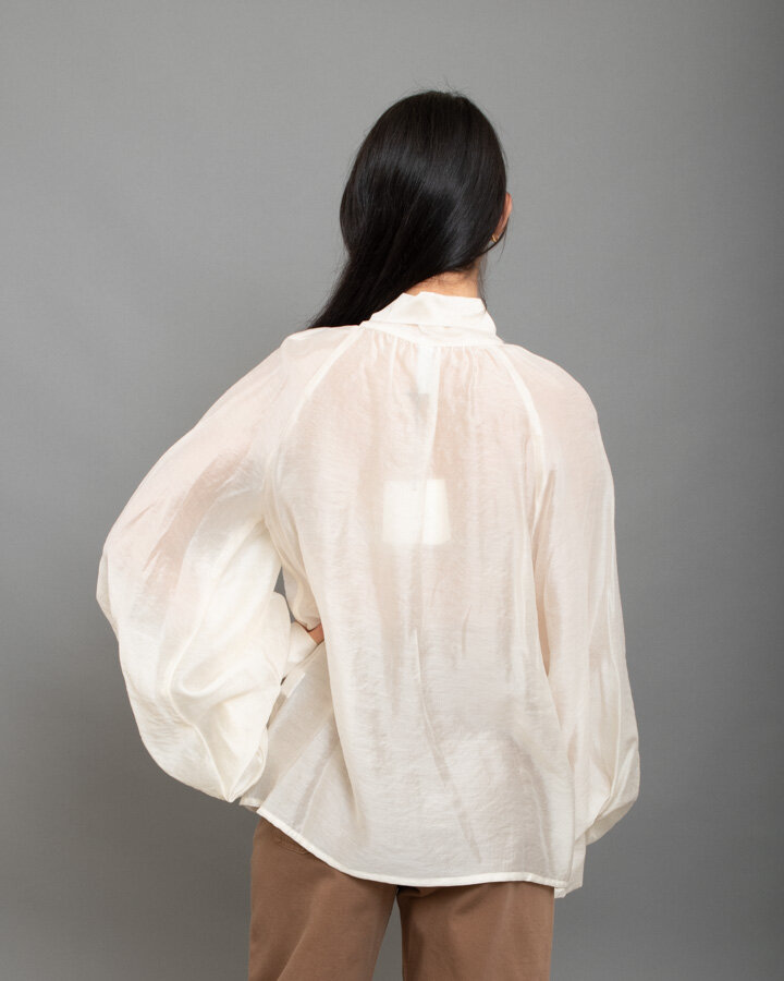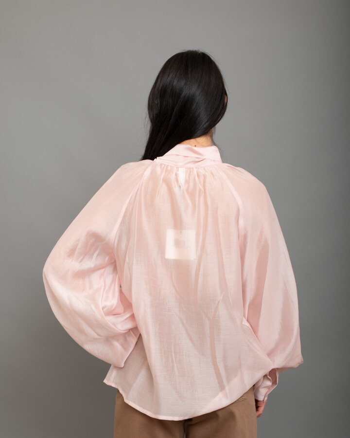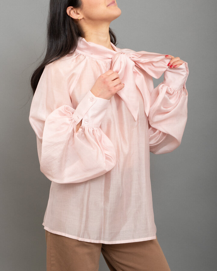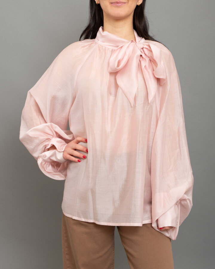 Blusa elegante in tessuto leggero con maxi fiocco sul collo e maniche voluminose.