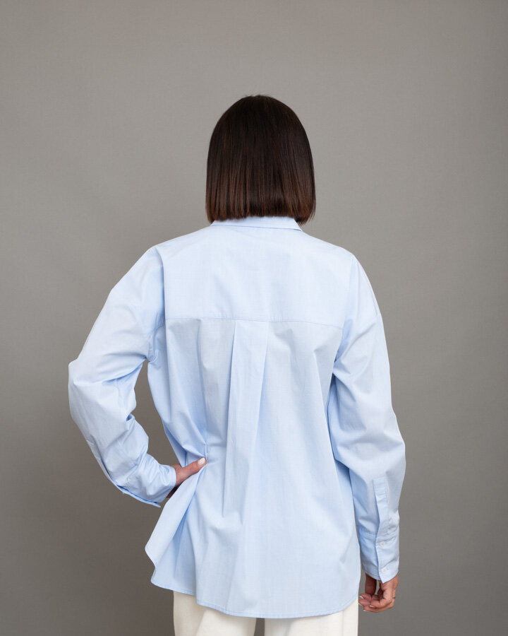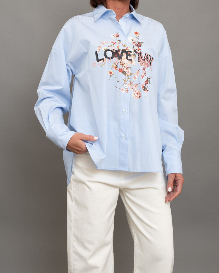 Camicia classica con decorazione floreale, scritta “LOVE MY” con strass rosa, sfondo piega sul retro.