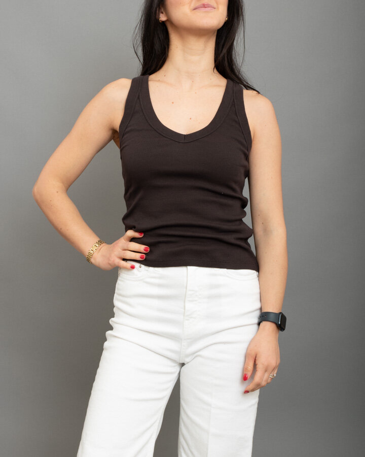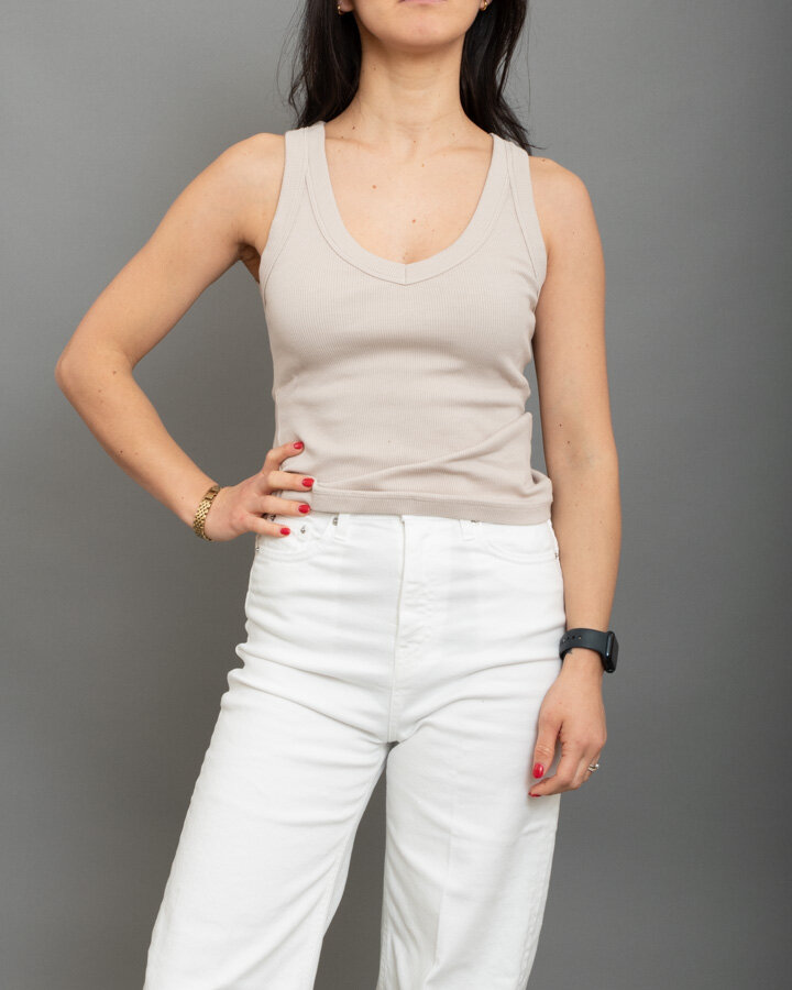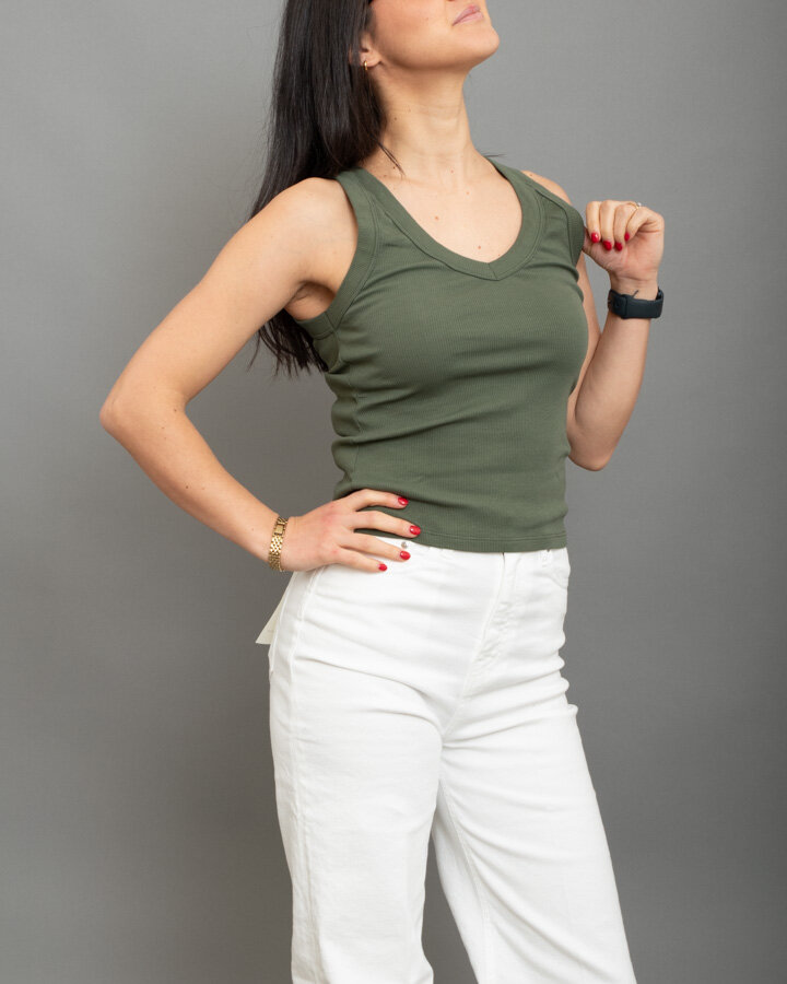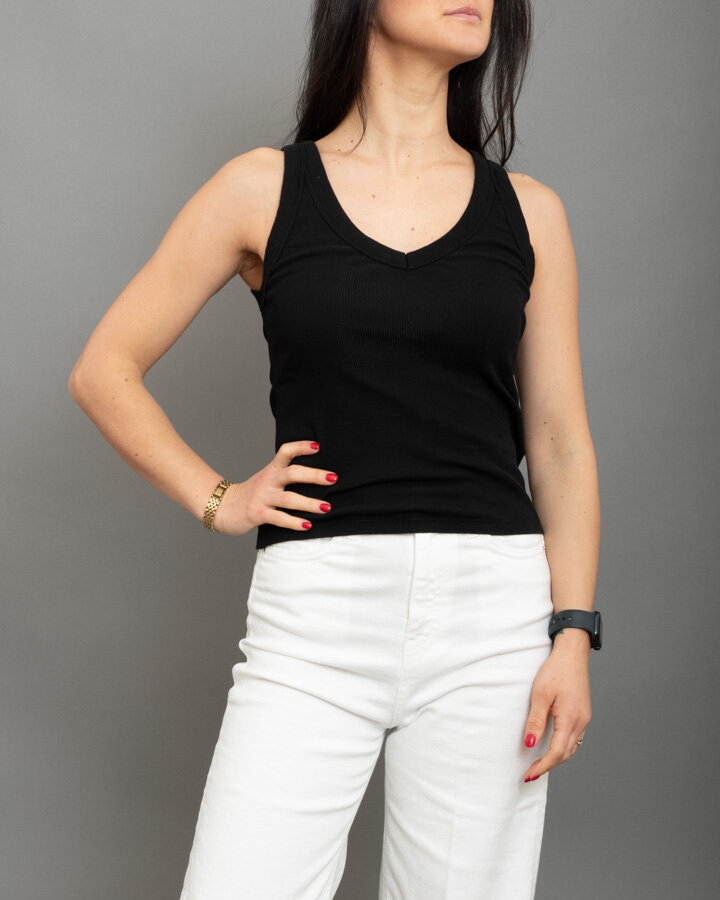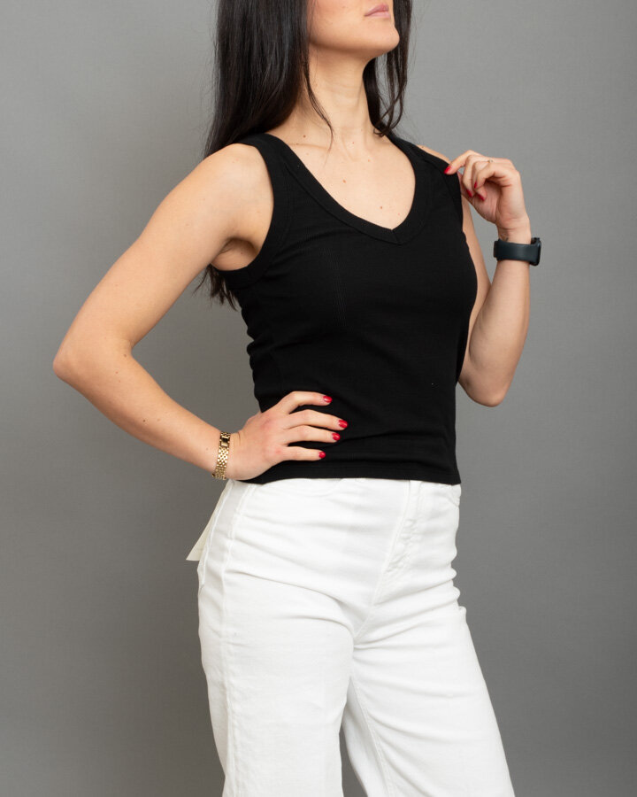 Canotta scollo a “V”, a costine, bordi spessi.