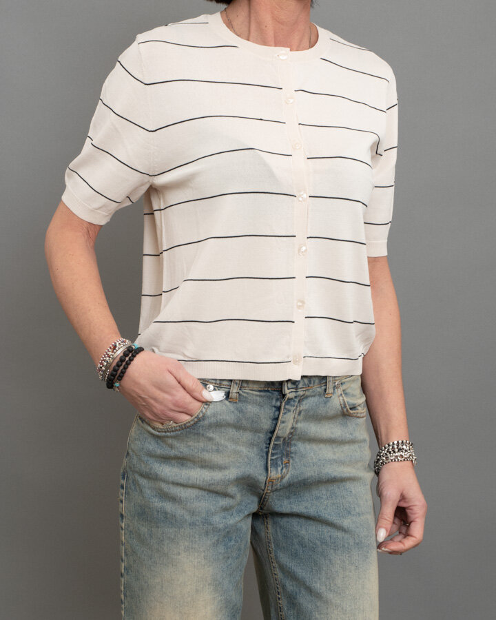 Cardigan leggero a righe dal design essenziale e versatile, perfetto per la mezza stagione.