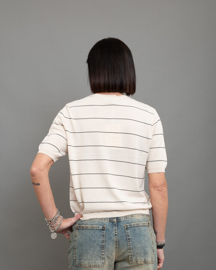 Dettagli: Girocollo, abbottonatura frontale, manica corta, righe orizzontali a contrasto, finiture a costine