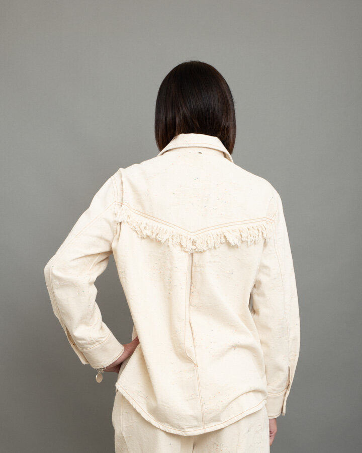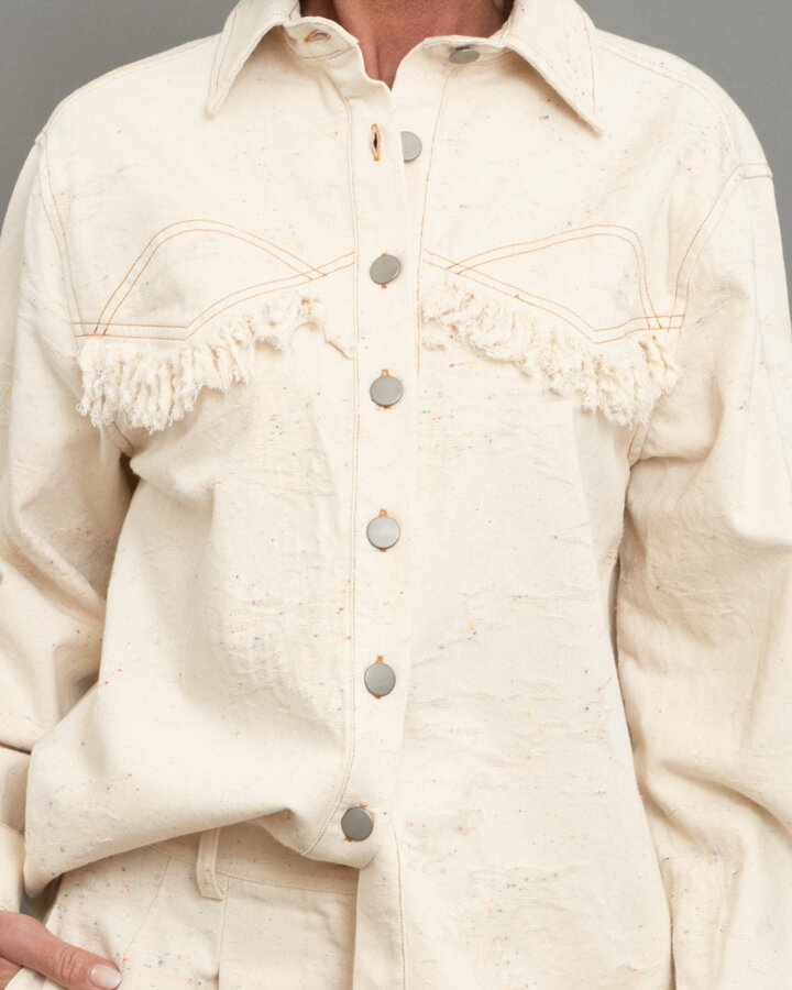 Giacca camicia con frange frontali che continuano sulla schiena, con chiusura a bottoni metallici argento, texture compatta leggermente puntinata.
