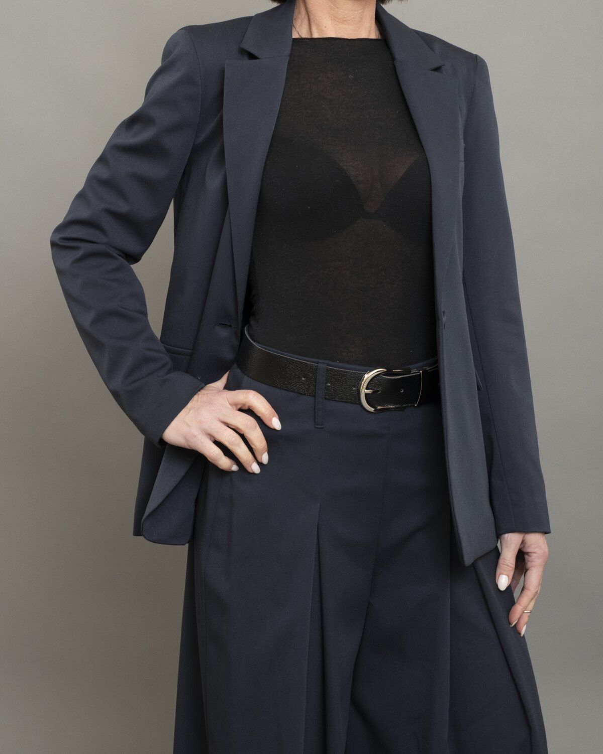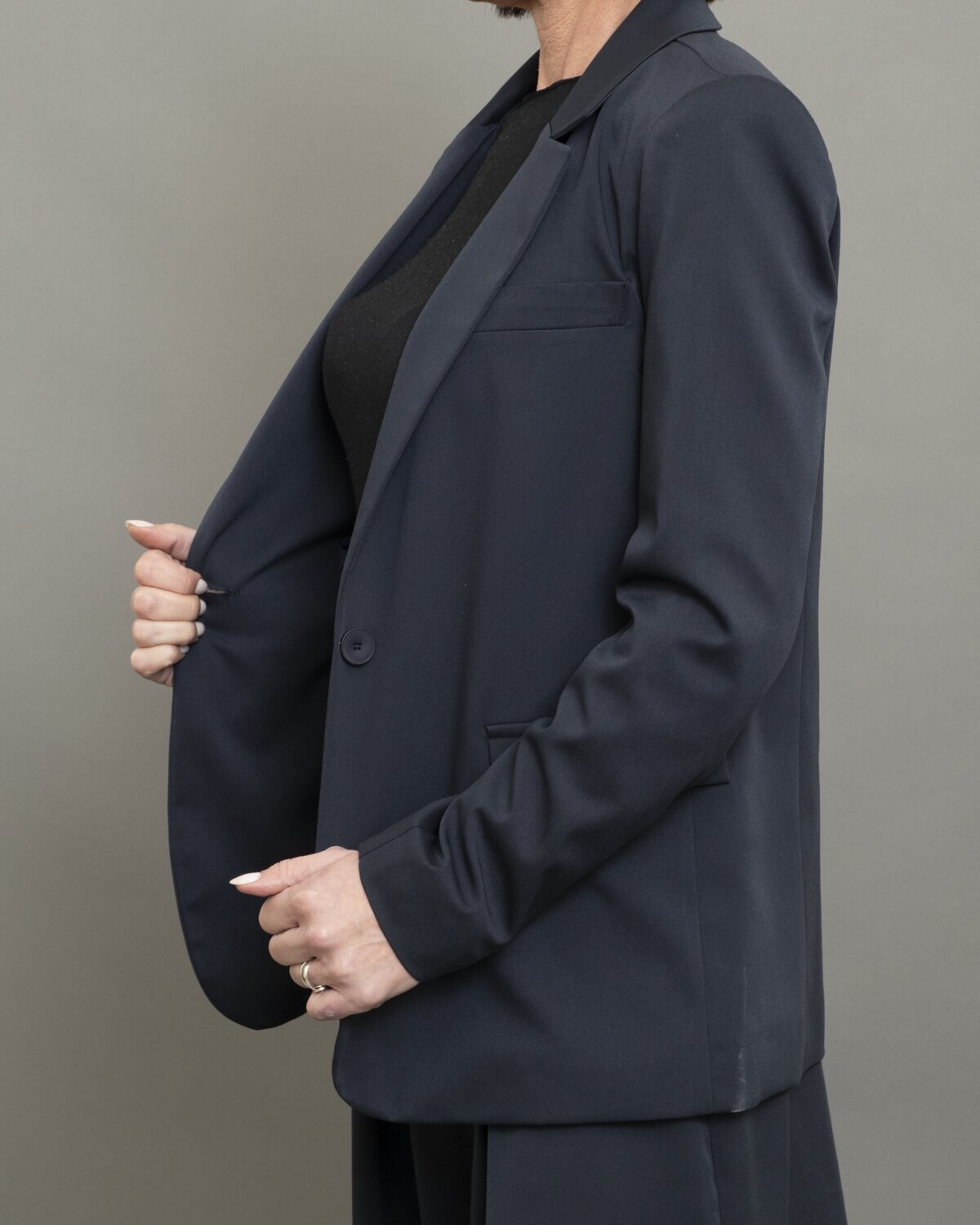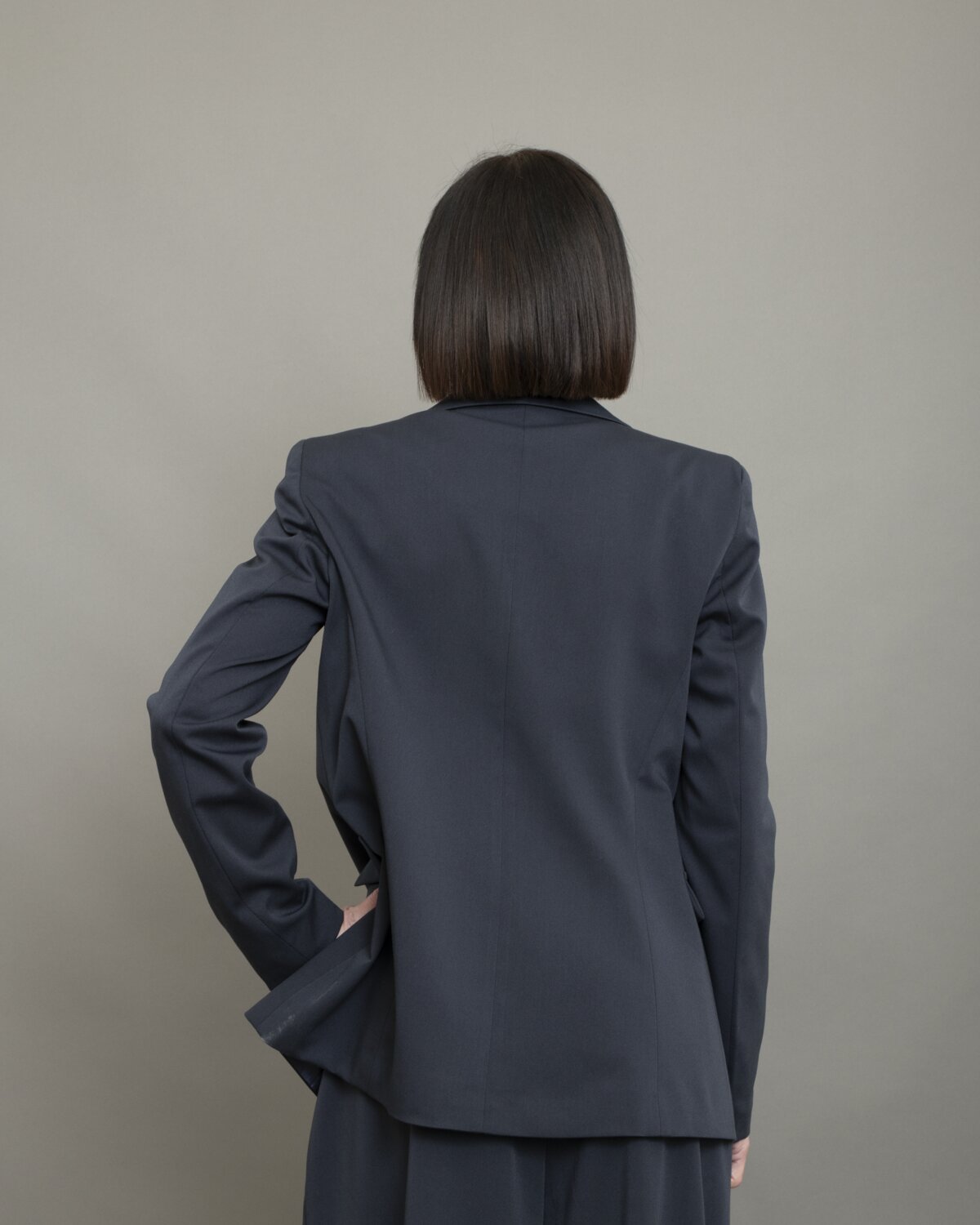 Giacca slim in blu notte presenta un taglio asciutto e una linea pulita che valorizza la figura con eleganza, mentre il tessuto tecnico ha una mano fluida e una leggera elasticità che garantisce comfort e tenuta. Il colore profondo e versatile si adatta a look formali, minimal o contaminati da elementi street. Un capo essenziale, pensato per chi cerca precisione sartoriale e praticità quotidiana.
