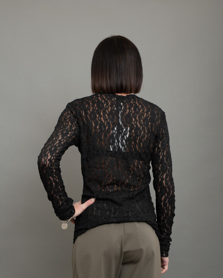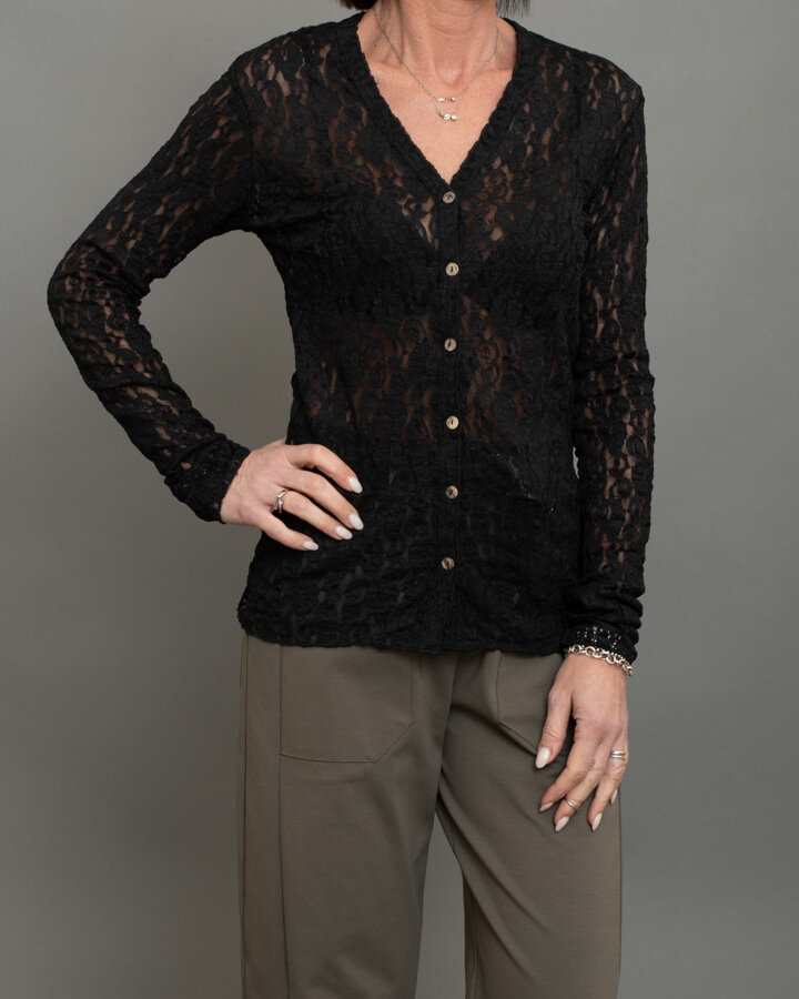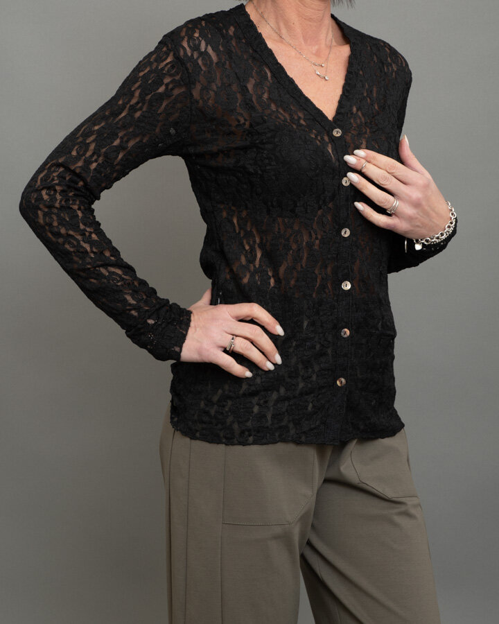 Cardigan in pizzo nero dal fascino sofisticato e femminile, perfetto per aggiungere un tocco elegante anche ai look più semplici.