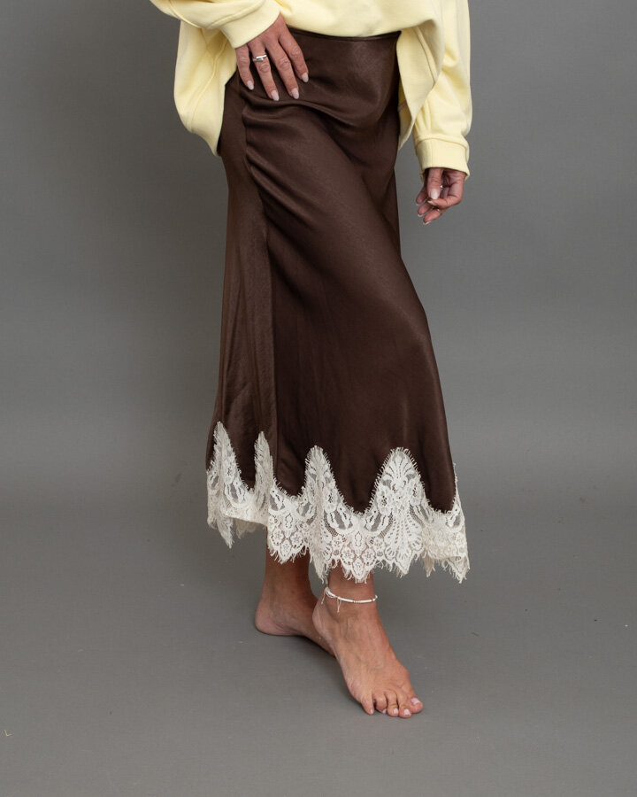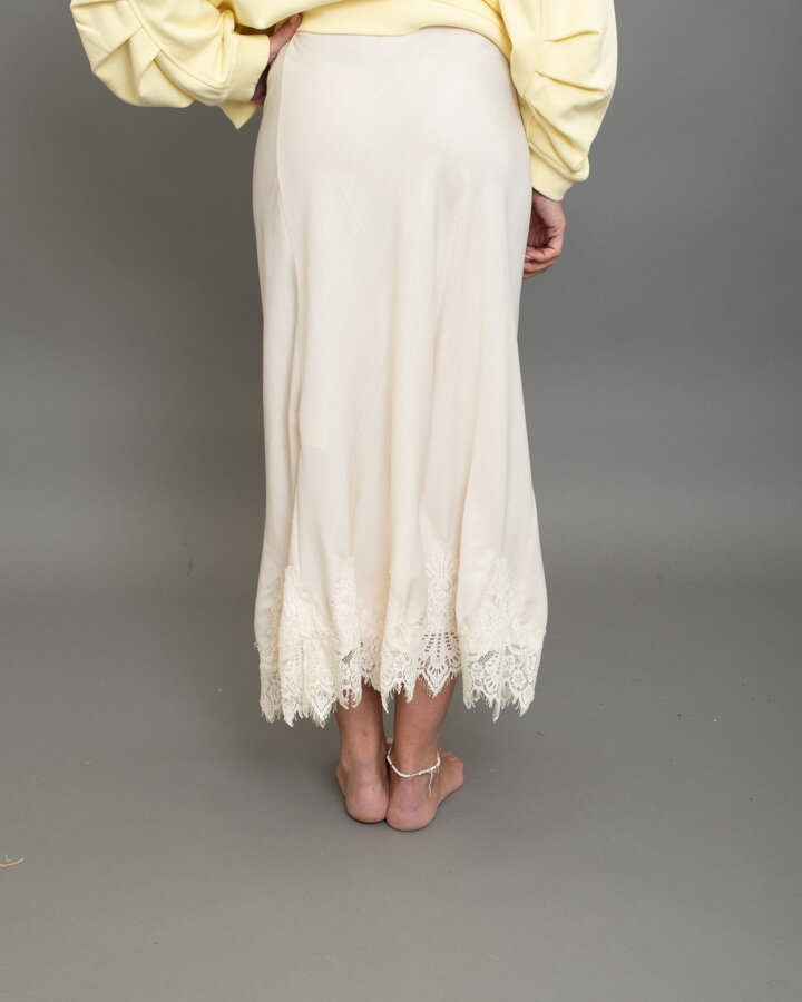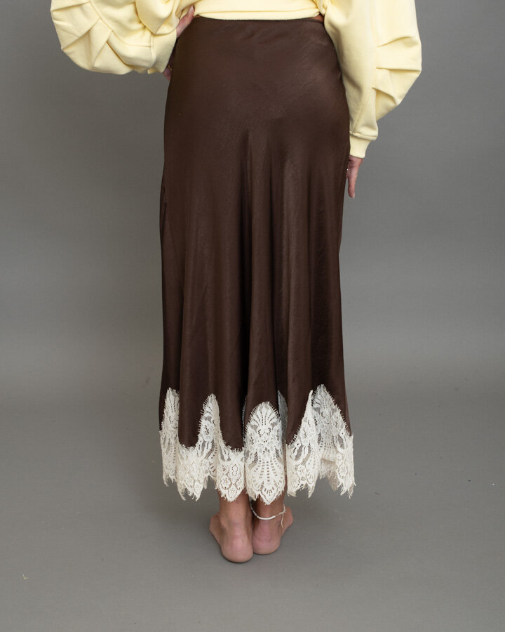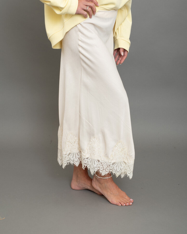 Gonna midi in satin, fondo impreziosito da pizzo a contrasto bianco
