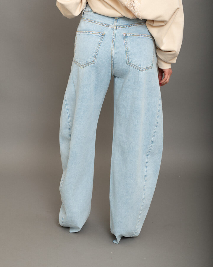 Jeans wideleg azzurro a vita alta con cinque tasche, gamba extraampia e fit rilassato che slancia la figura con un look casual moderno.