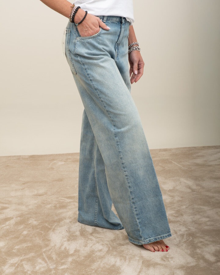 Jeans wide leg, vita alta, lavaggio chiaro sabbiato.