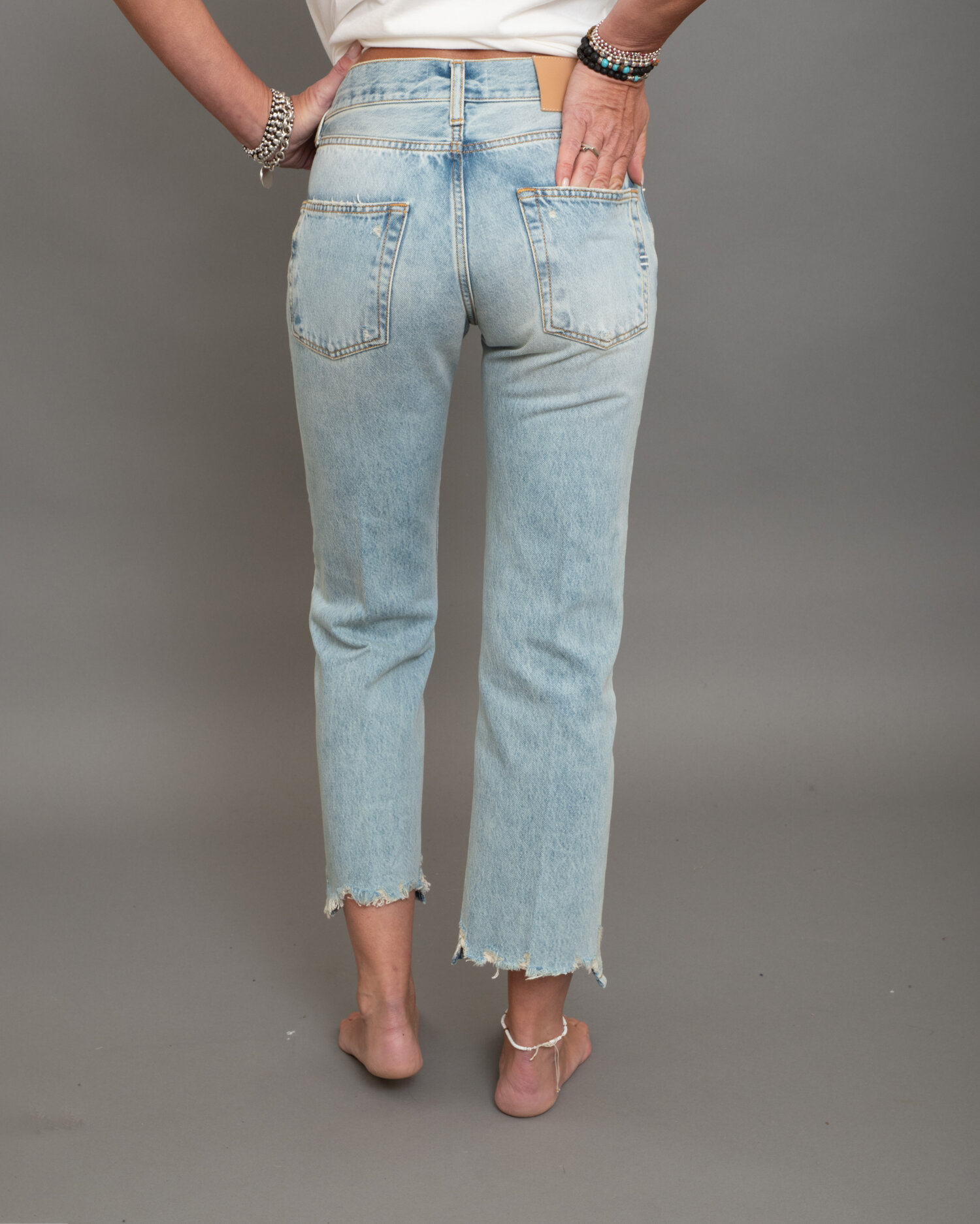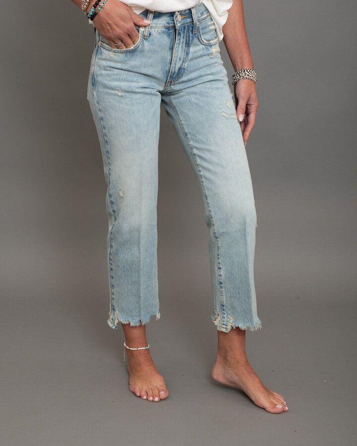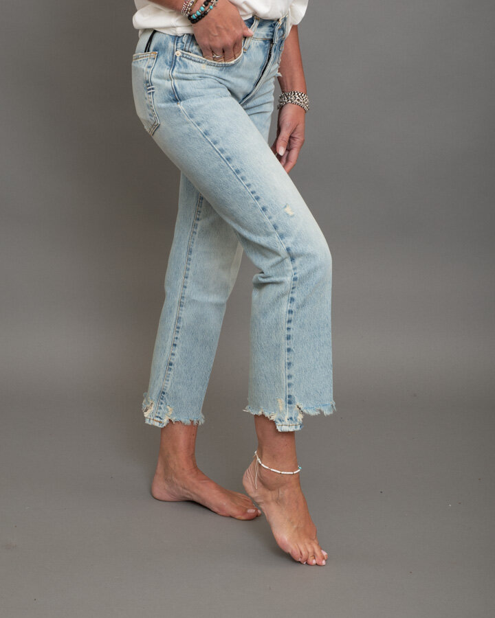 Jeans a vita alta in denim chiaro effetto vissuto, con gamba dritta leggermente cropped, piccoli strappi e fondo sfrangiato.