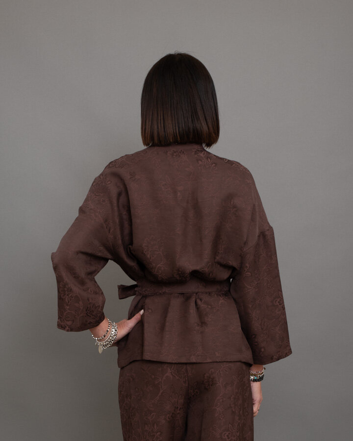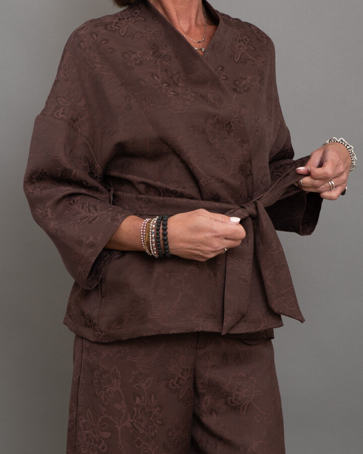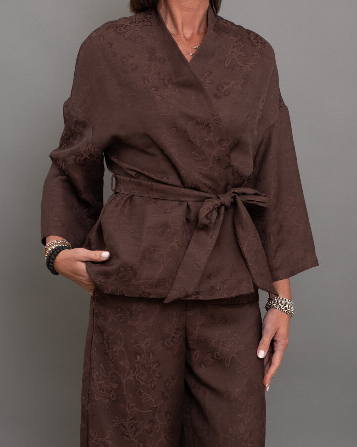 Kimono con chiusura a cintura in vita, motiva floreale ricamato in leggere contrasto su tutta la superficie.