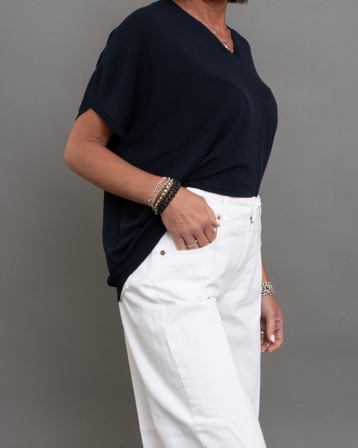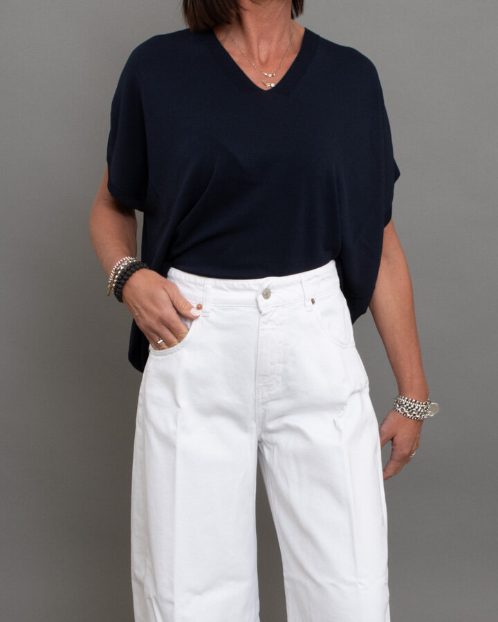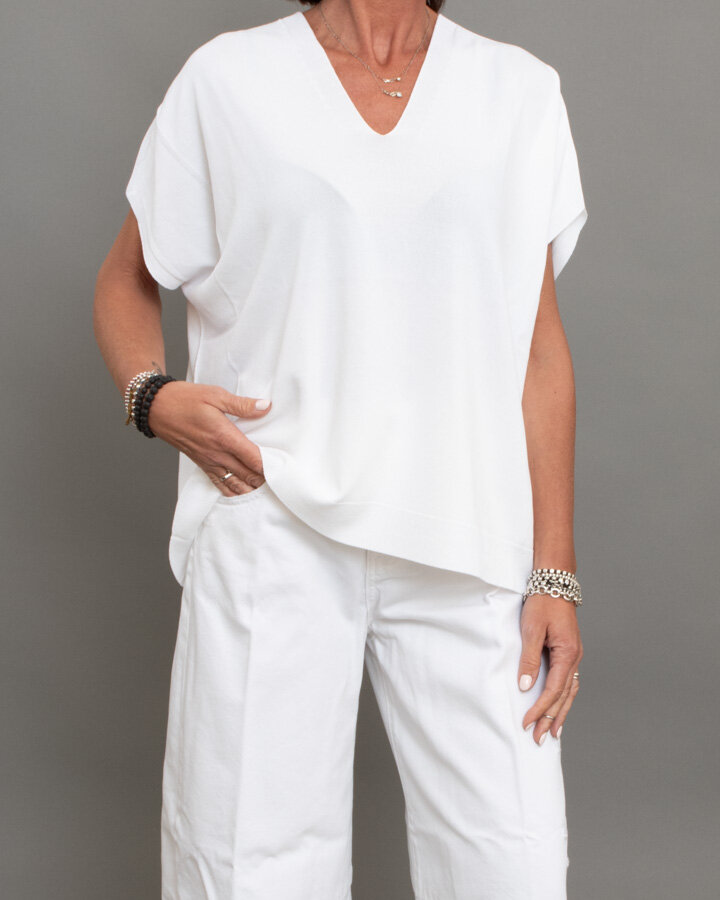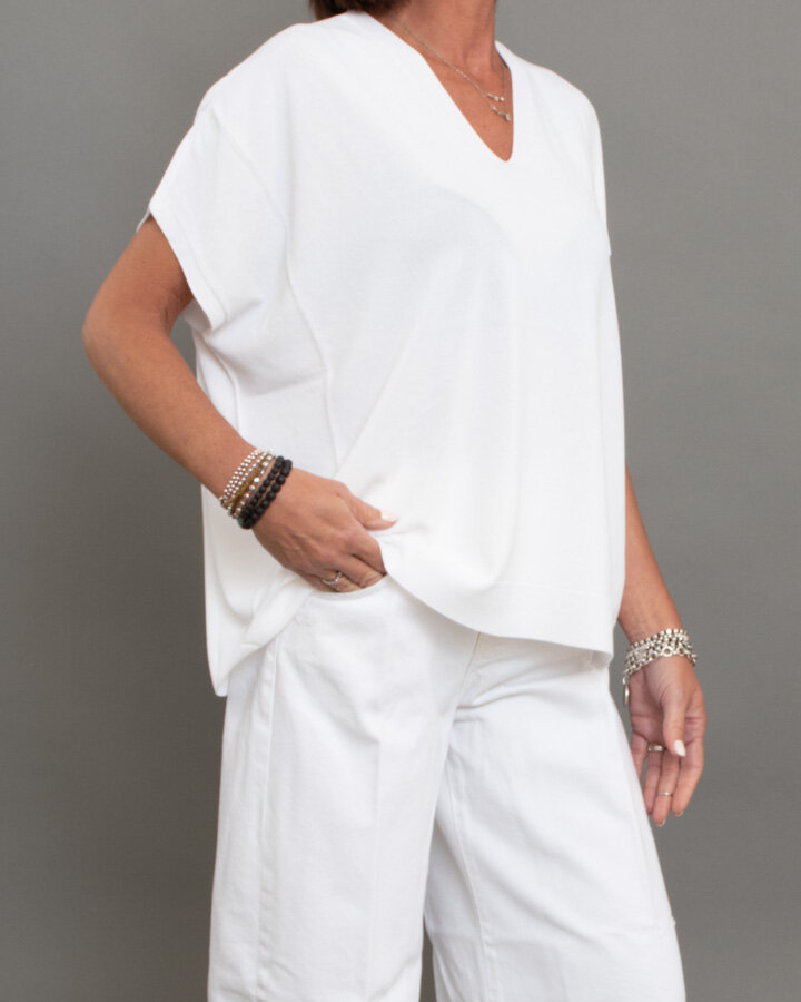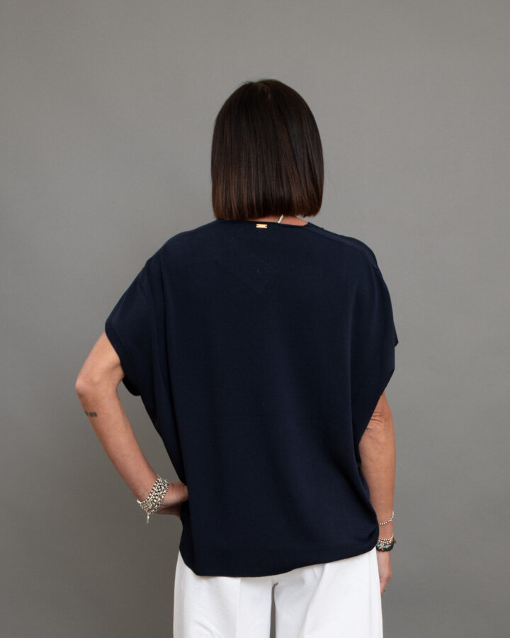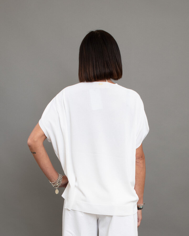 Maglia a maniche corte, scollo a “V”, bordi rifiniti a coste.