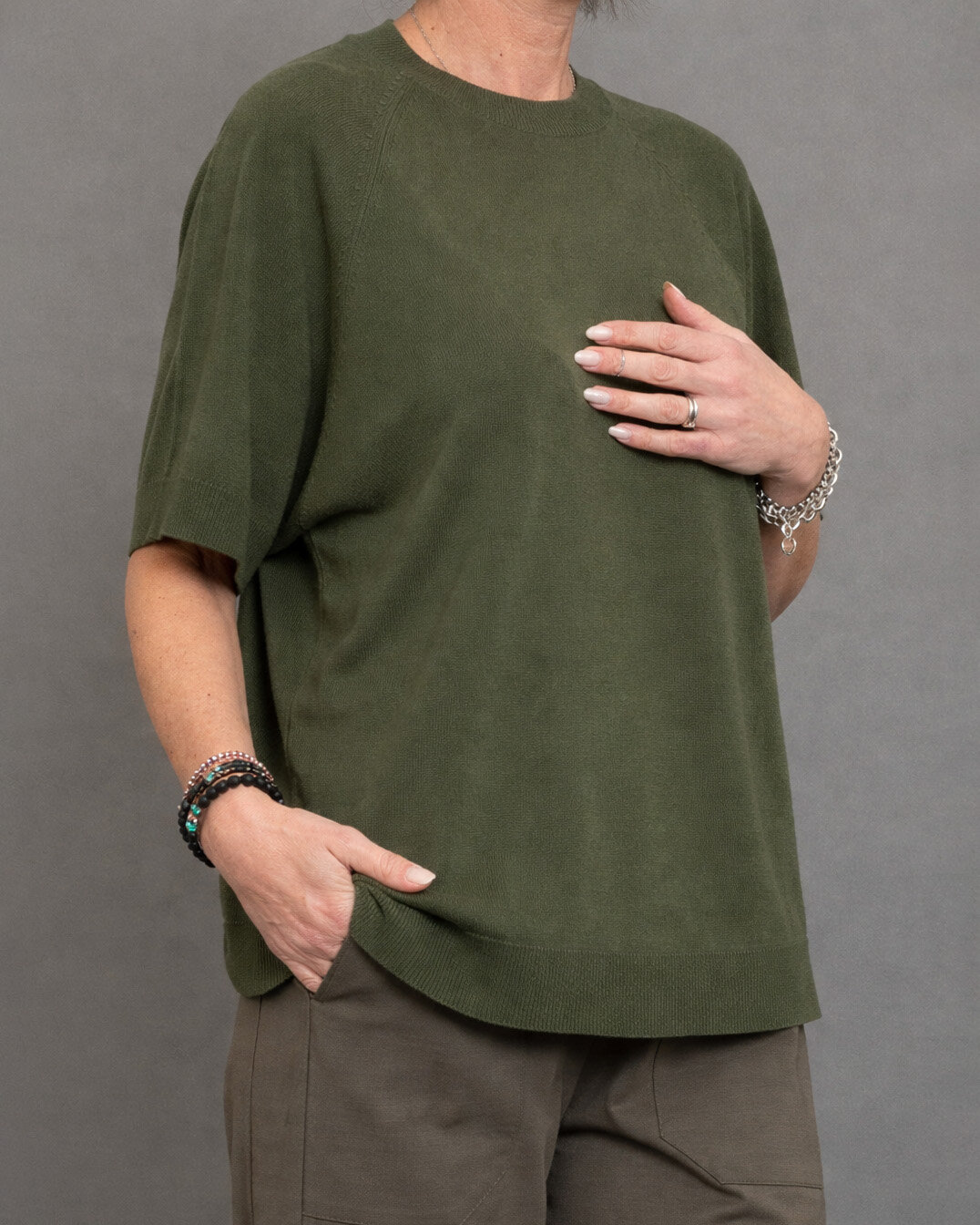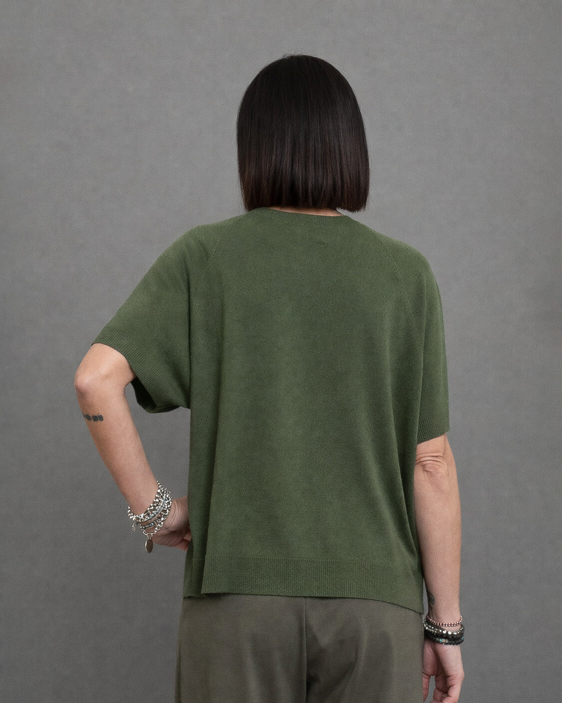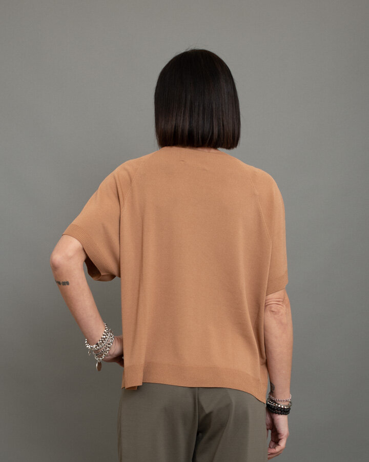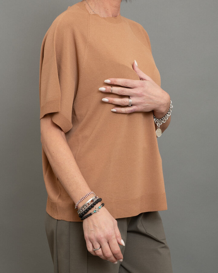 Maglia in maglia fine dal taglio moderno con maniche corte over e linea morbida, perfetta per un look rilassato ma curato. Realizzata in misto viscosa, garantisce una vestibilità fluida e piacevole al tatto. Il design essenziale è valorizzato dalla spalla leggermente scesa e dalle finiture a costina su collo, maniche e fondo.