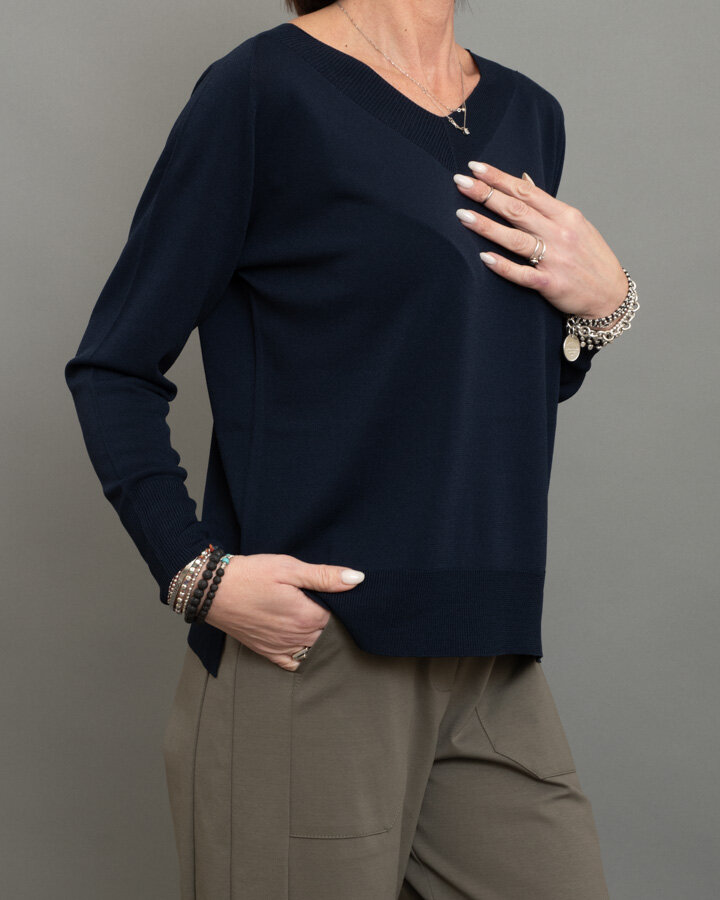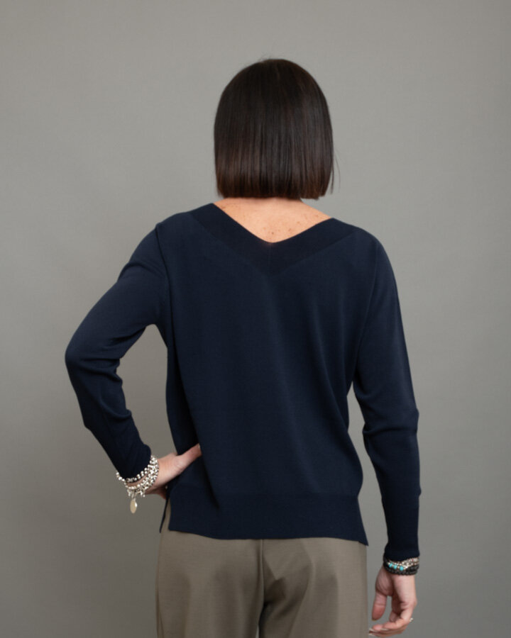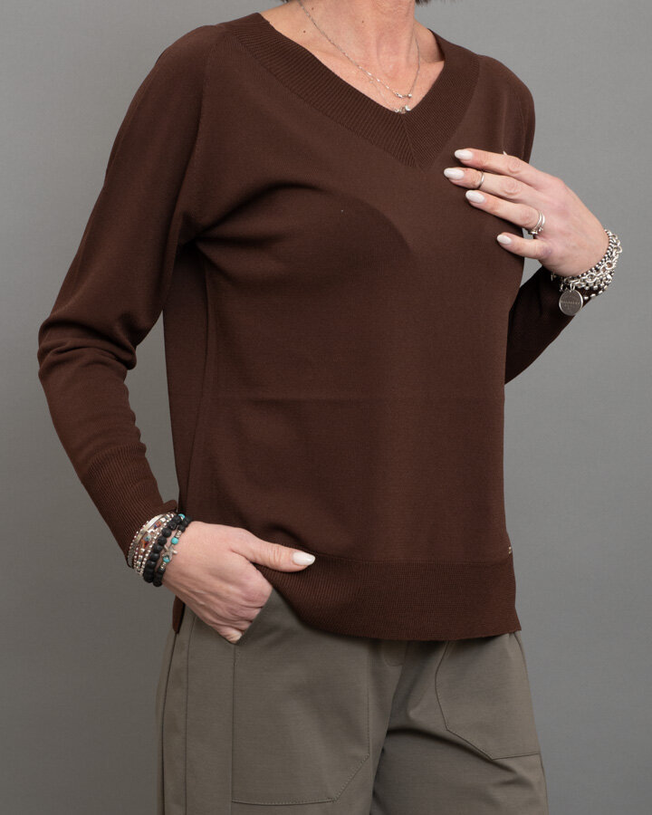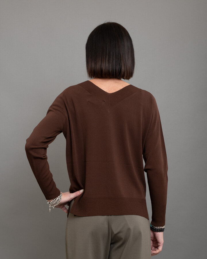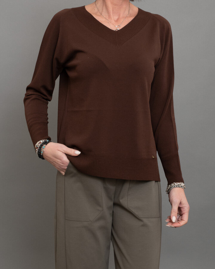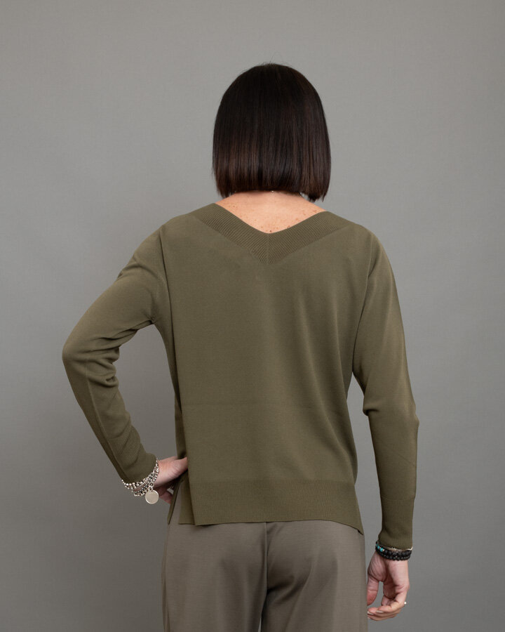 Maglia dal design essenziale e raffinato, perfetta per look quotidiani curati ma confortevoli. Realizzata in morbido mix viscosa, presenta scollo a V con lavorazione a costina, linea pulita e vestibilità regolare che scivola delicatamente sulla silhouette.