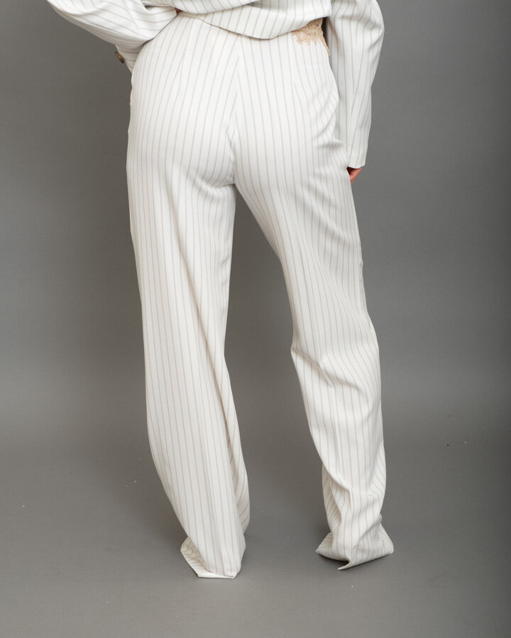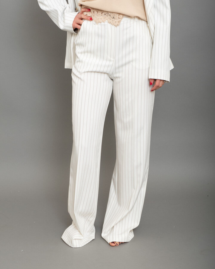 Pantalone wide leg, gessato bianco con righe a constrato moro, vita alta, due tasche frontali.
