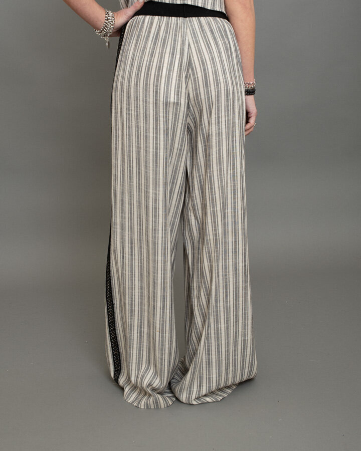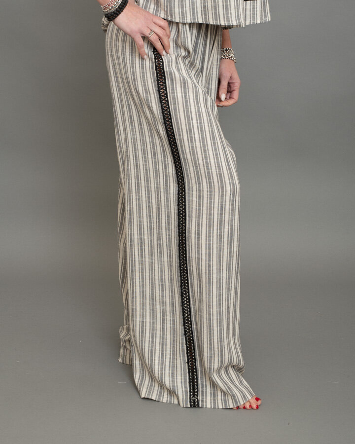 Pantalone palazzo in misto viscosa e lino dalla linea ampia e fluida, caratterizzato da fantasia a righe verticali nei toni naturali che slanciano la figura.