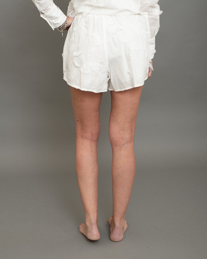 Short dal design fresco e romantico, impreziositi da delicati inserti in pizzo a forma di farfalla applicati su tutta la superficie. La linea morbida e la vita elasticizzata garantiscono comfort e vestibilità pratica, mantenendo uno stile leggero e femminile. Perfetti da indossare in coordinato con la camicia abbinata o da mixare con top essenziali per un look estivo raffinato e contemporaneo.