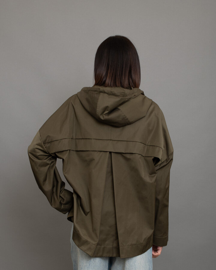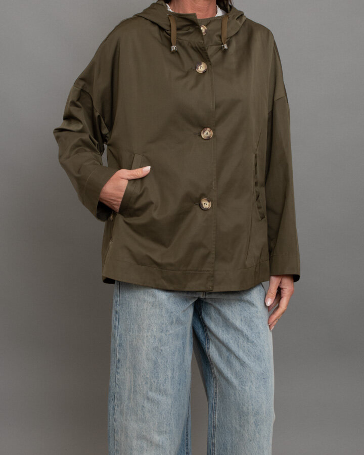 Spolverino corto over, spalle scese, chiusura a bottoni chiari ripresi anche sul polsino, cappuccio e sfondo piega sul retro.