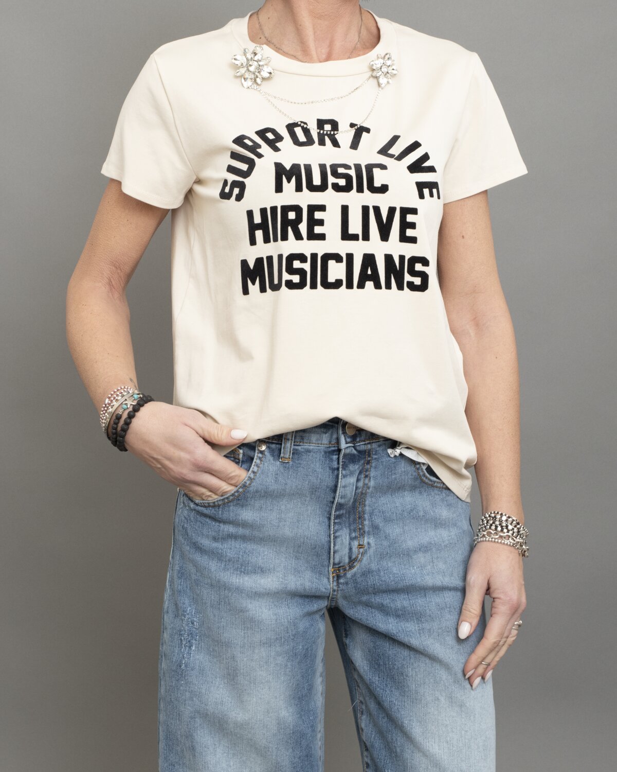 Dettagli: Scritta frontale a contrasto “Support Live Music hire Musicians”