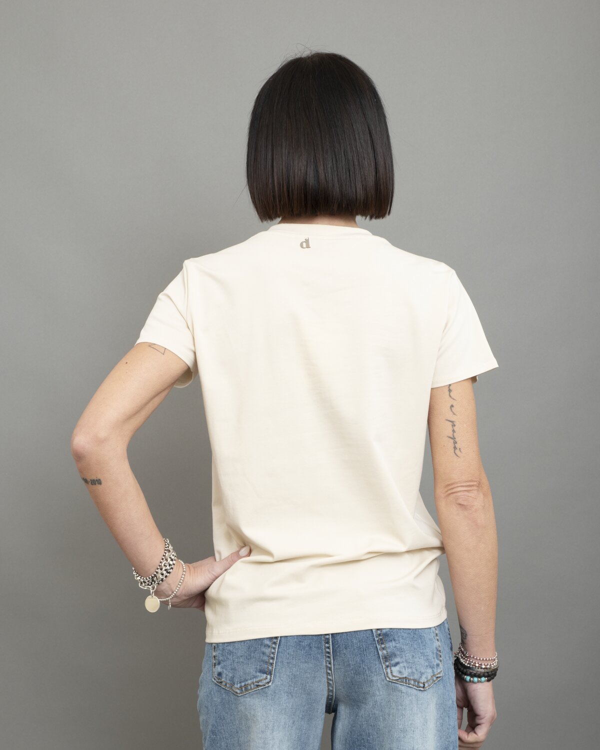 Tshirt realizzata in cotone. La mano è più strutturata e pulita, con una superficie uniforme che mantiene meglio la forma. La vestibilità è regolare, il girocollo essenziale e la scritta frontale aggiunge un dettaglio grafico che rende il capo immediato e contemporaneo. A rendere il capo più luminoso una spilla con strass. Una tshirt dal carattere deciso, perfetta per look minimal, street o layering quotidiani.