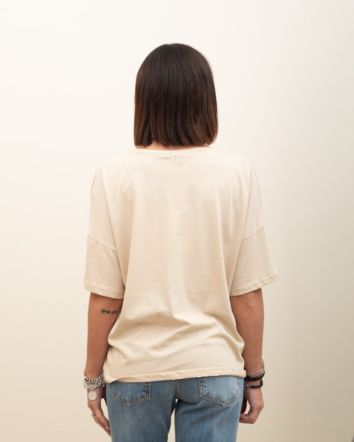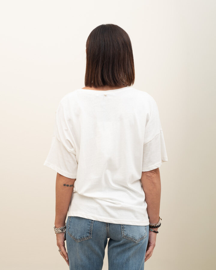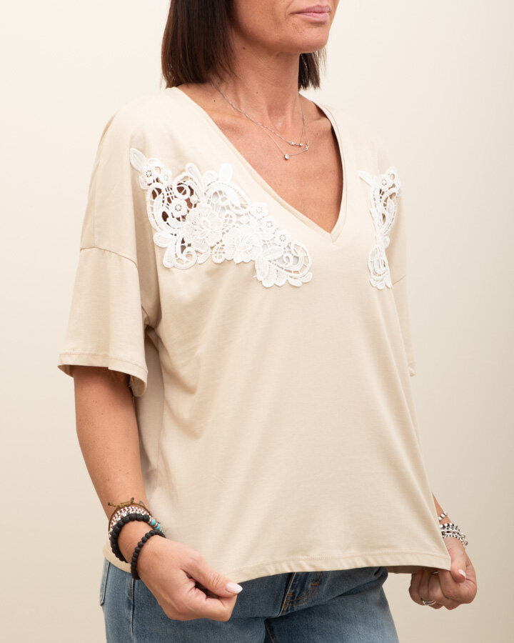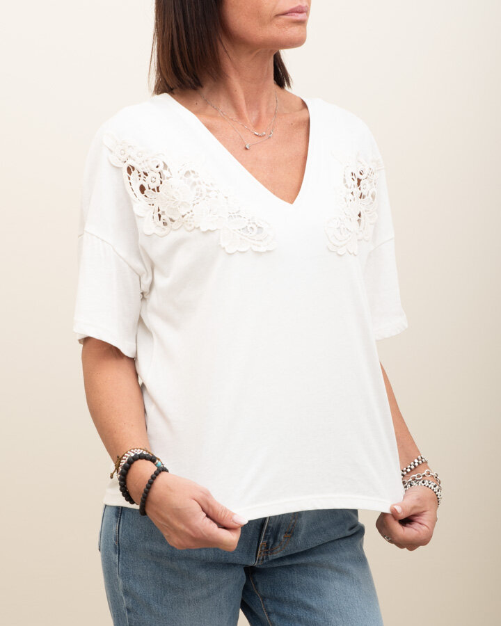 T-shirt in cotone morbido dalla vestibilità over, con scollo a V e maniche ampie, dettaglio in pizzo floreale nella parte anteriore.