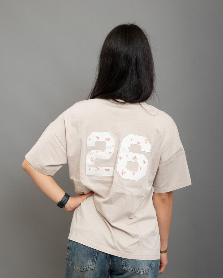 T-shirt over, girocollo, numero “26” applicato sul retro stile varsity con stampa floreale.