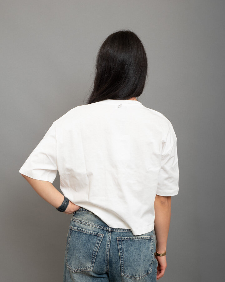 T-shirt crop in cotone, collo a costina con cucitura rafforzata e nodo in vita.