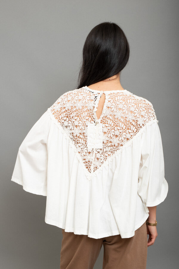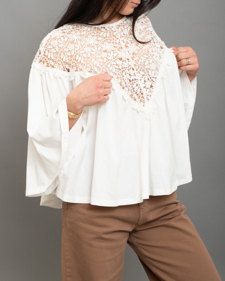 Blusa bianca con inserto in pizzo floreale sul carré, maniche ampie e linea fluida, un modello romantico e luminoso dalleleganza bohémien.