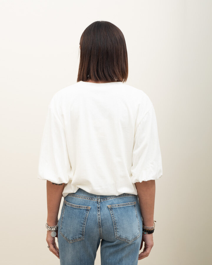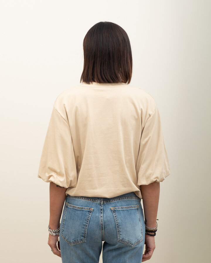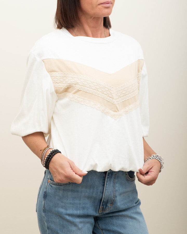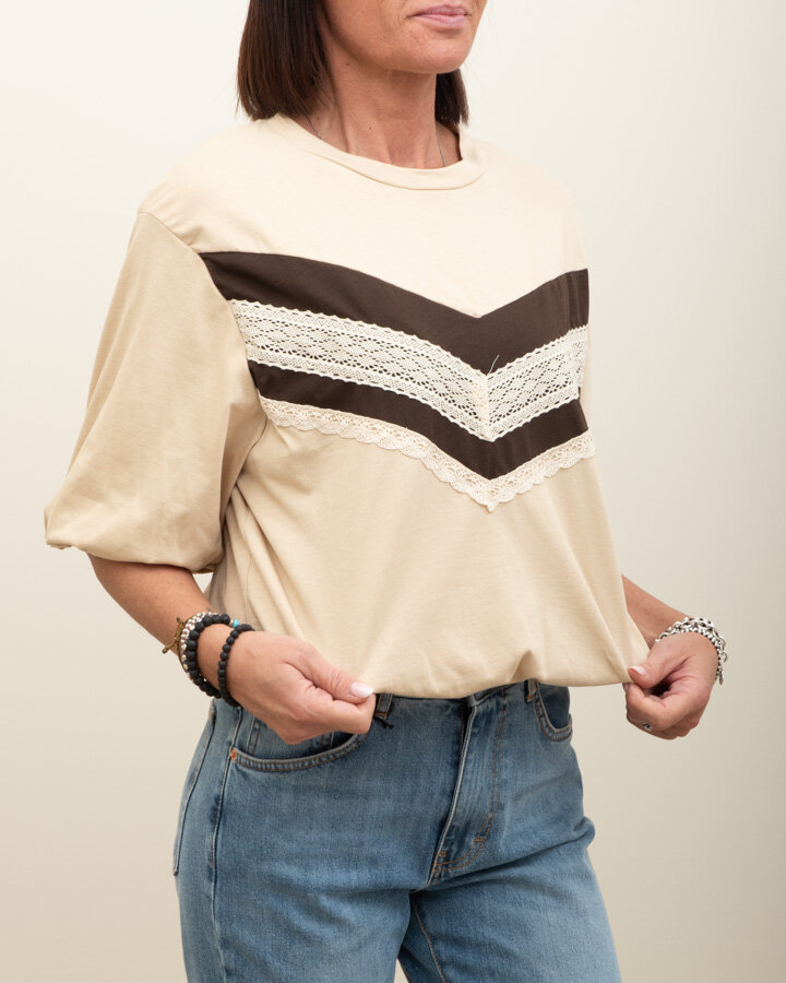 T-shirt con maniche leggermente, inserto frontale con pizzo e contrasto cromatico che crea un effetto grafico elegante e valorizza il capo con carattere.