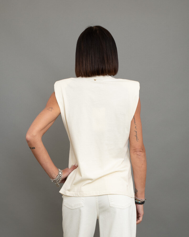 T-shirt con spallotte a girocollo, stampa a contrasto moro e scritta “Summer” con borchie tonde dorate.