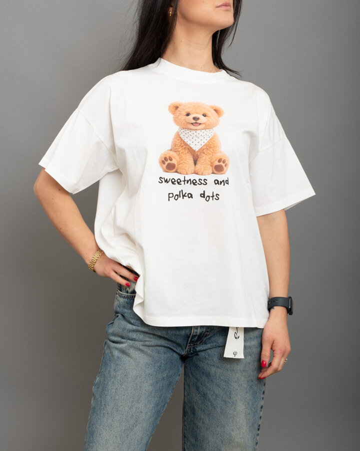 T-shirt girocollo, stampa con orsetto e strass, scritta “sweetness and polka dots”.