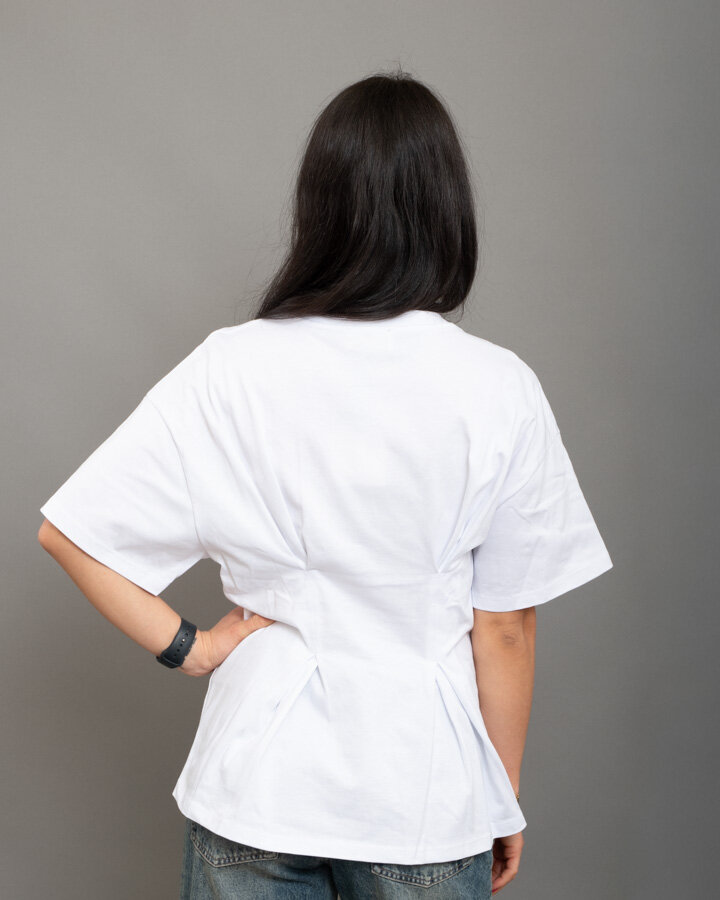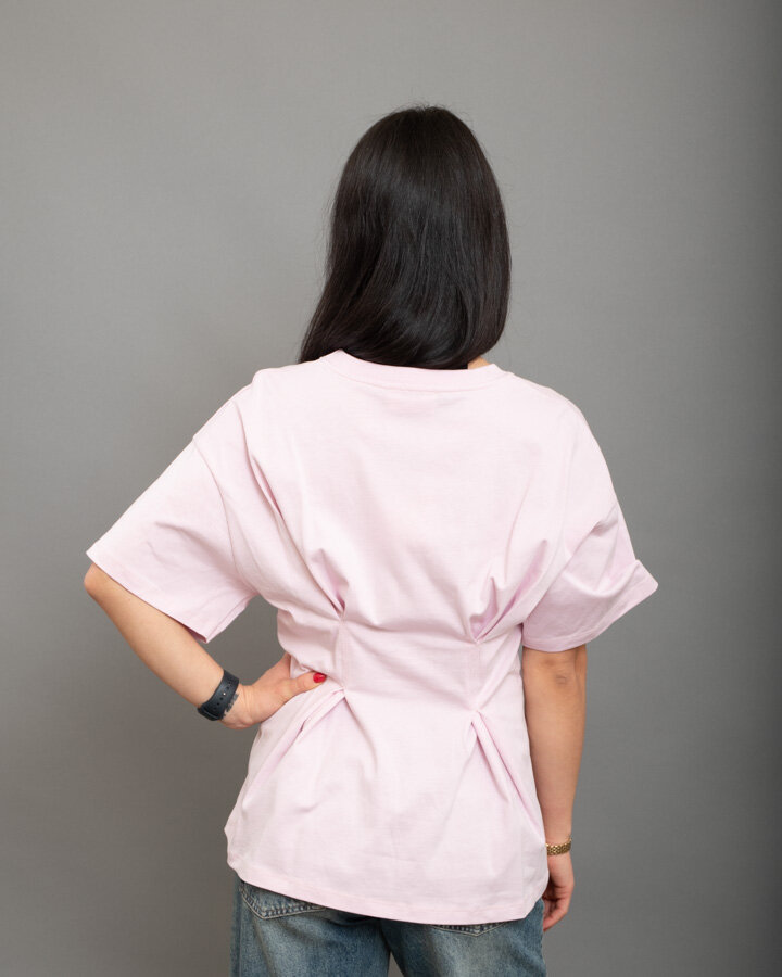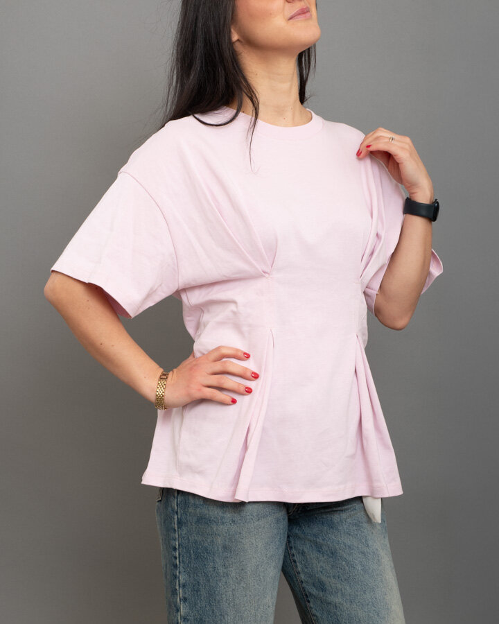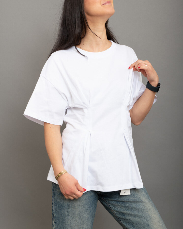 T-shirt girocollo, cuciture che evidenziano il punto vita.