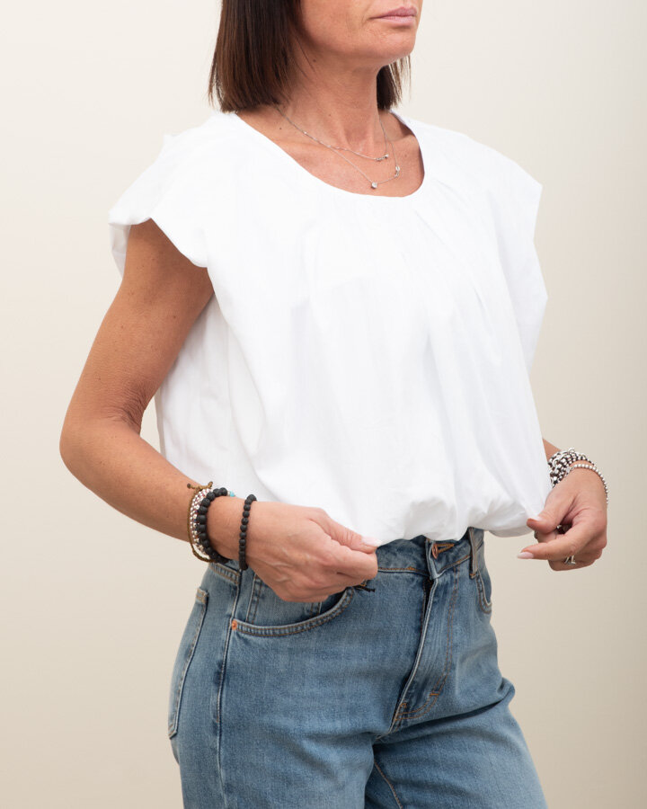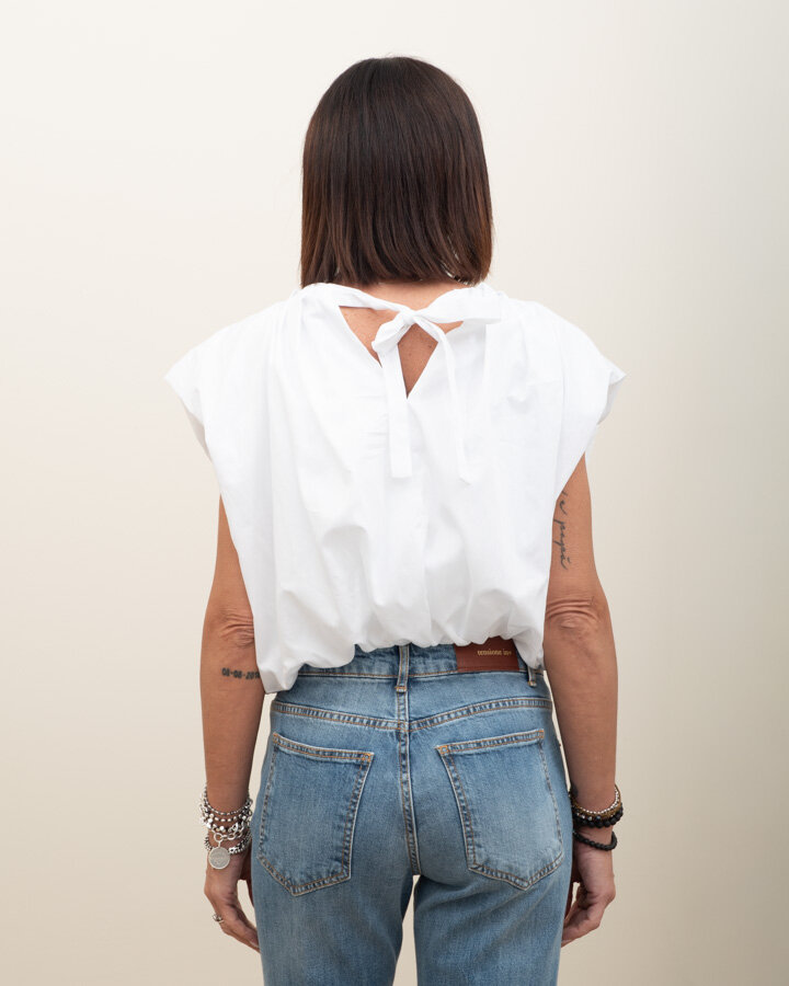Top blusa, fondo arricciato, spalle strutturate, chiusura a fiocco sul retro.