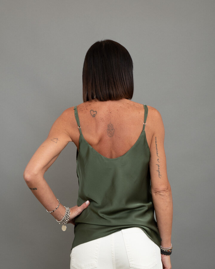 Top satinato scollo a “V” ripreso anche sul retro, spalline sottili.