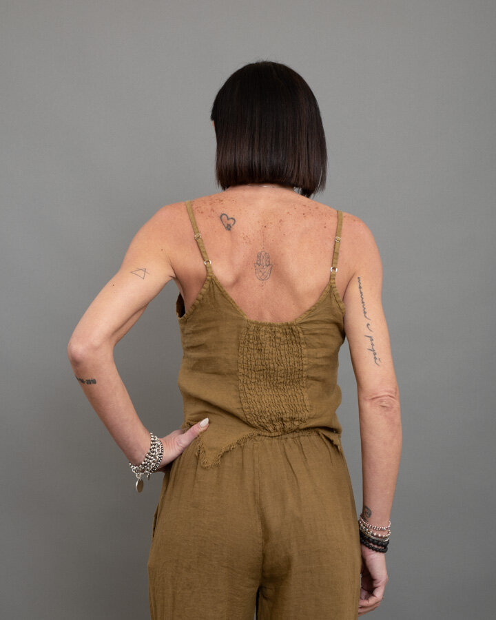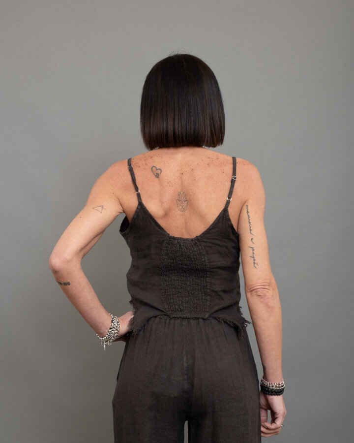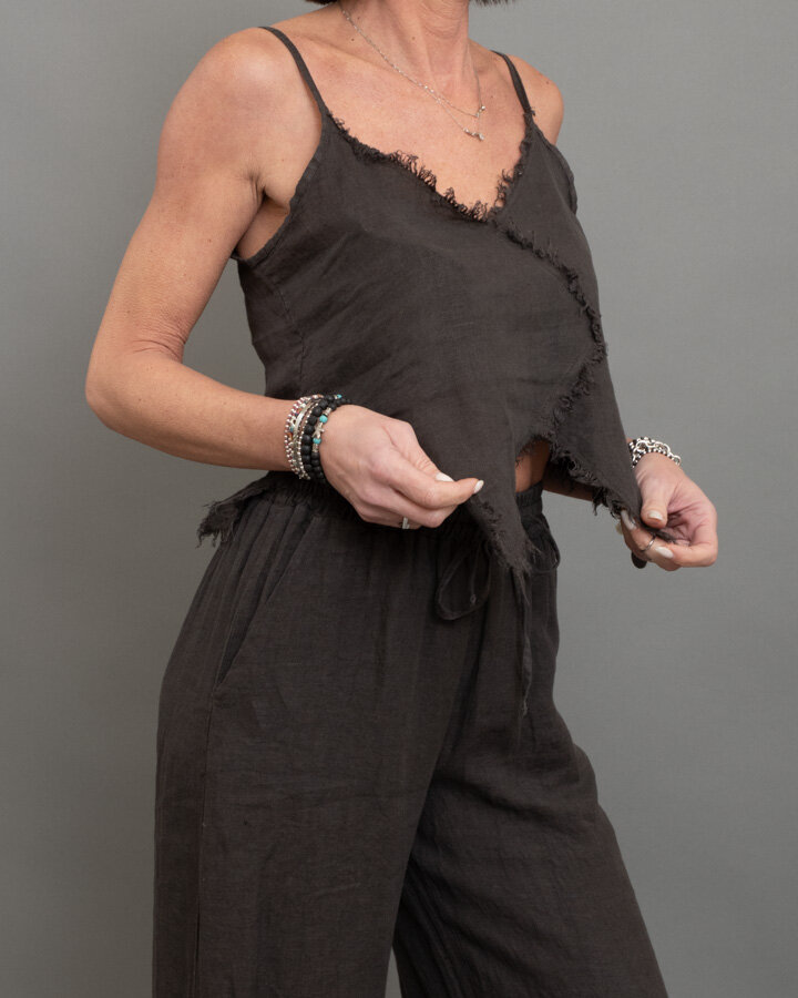 Top in lino dal carattere naturale e contemporaneo, perfetto per la stagione estiva. Il design leggero è valorizzato dallo scollo a V con profili sfrangiati che donano un effetto vissuto e ricercato. La linea asimmetrica con fondo irregolare crea movimento, mentre il retro con inserto elasticizzato garantisce una vestibilità confortevole e adattabile. Le spalline sottili regolabili completano il capo, rendendolo ideale da abbinare a pantaloni in lino coordinati o denim per un look fresco e sofisticato.